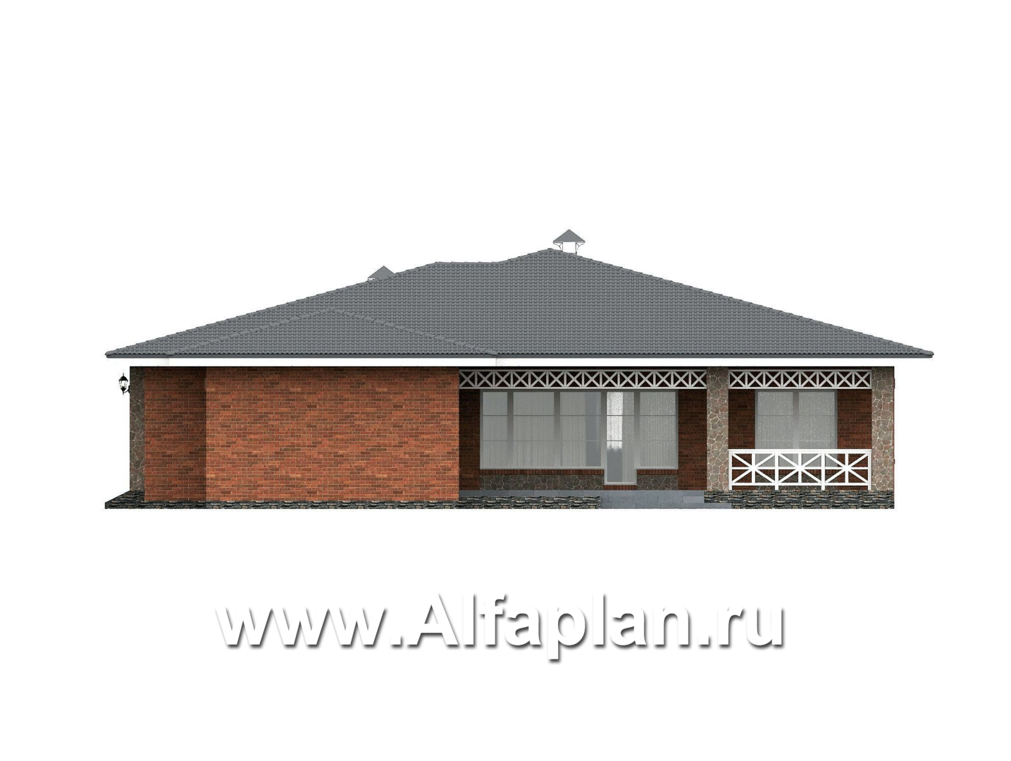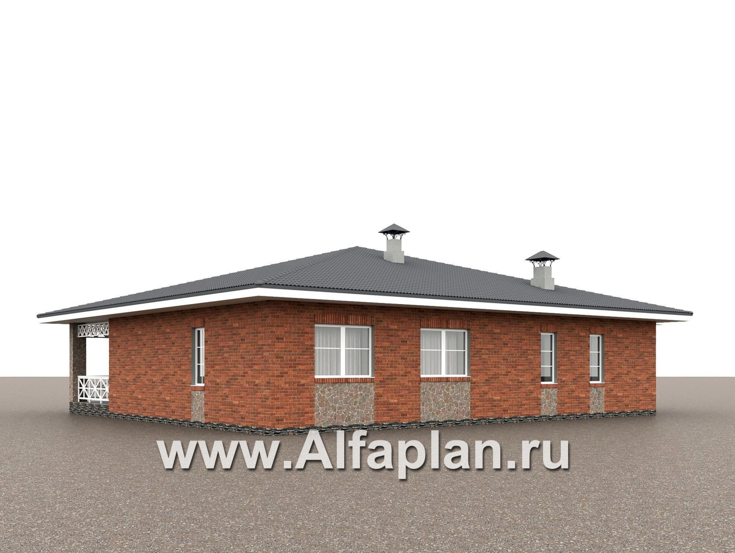 666A-2-S «Горизонталь» - проект одноэтажного дома с террасой, в немецком стиле, баварская кладка