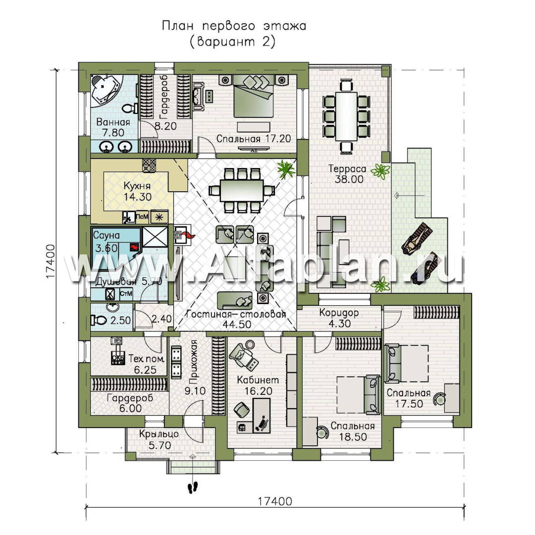 Проект одноэтажного дома «Горизонталь» 666А, 206 м2, 4 спальни, 2 варианта планировки.