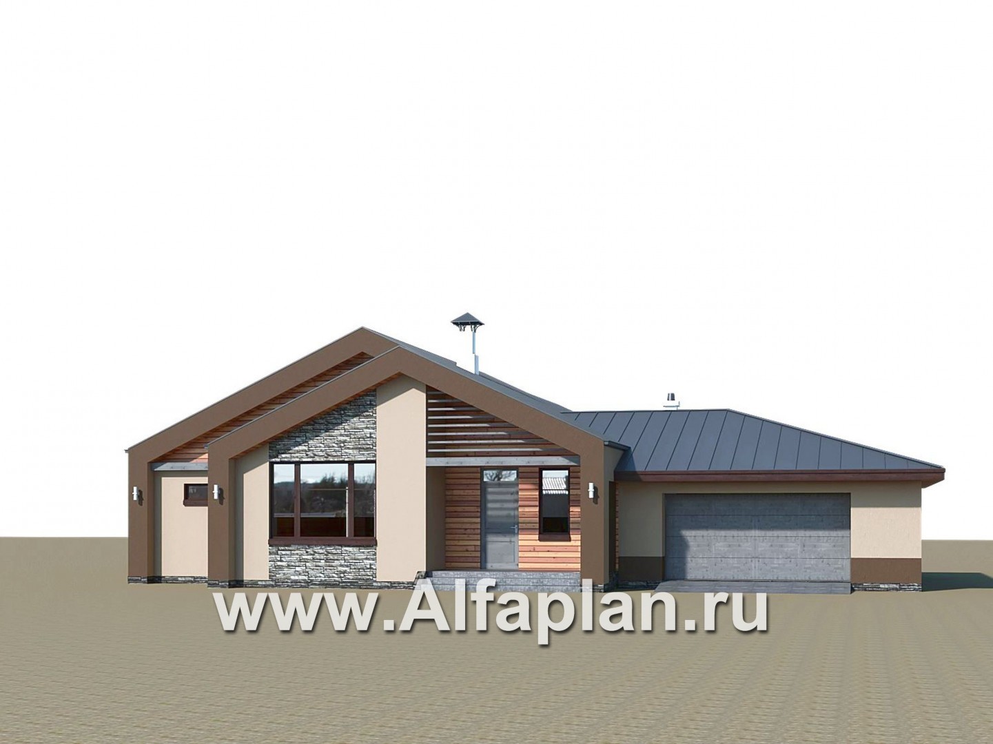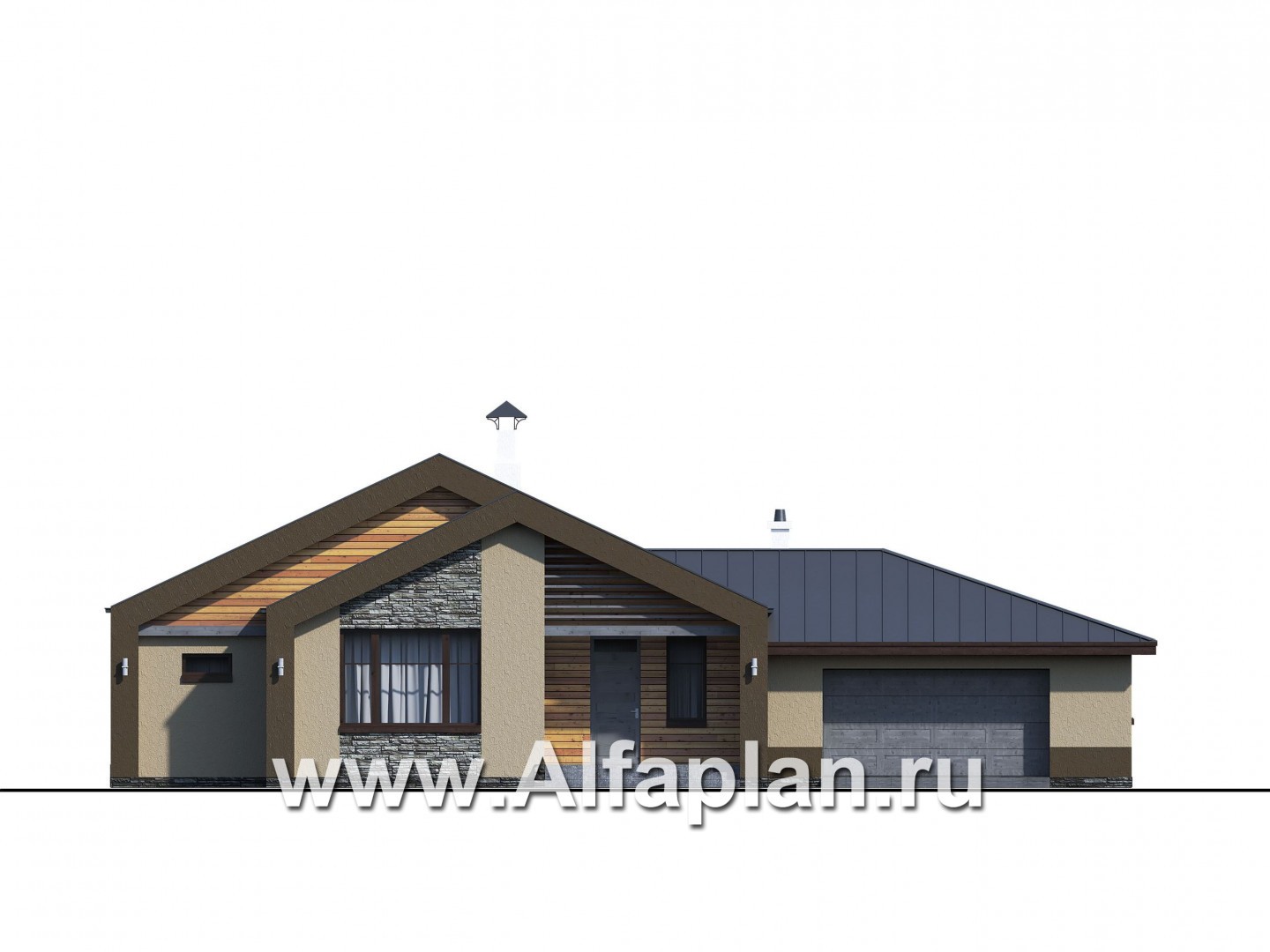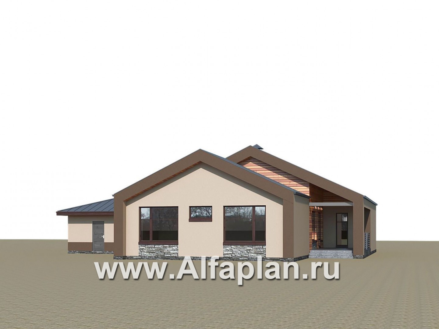 «Аркада» - проект одноэтажного дома, современный стиль, барнхаус, с террасой, сауной и с гаражом