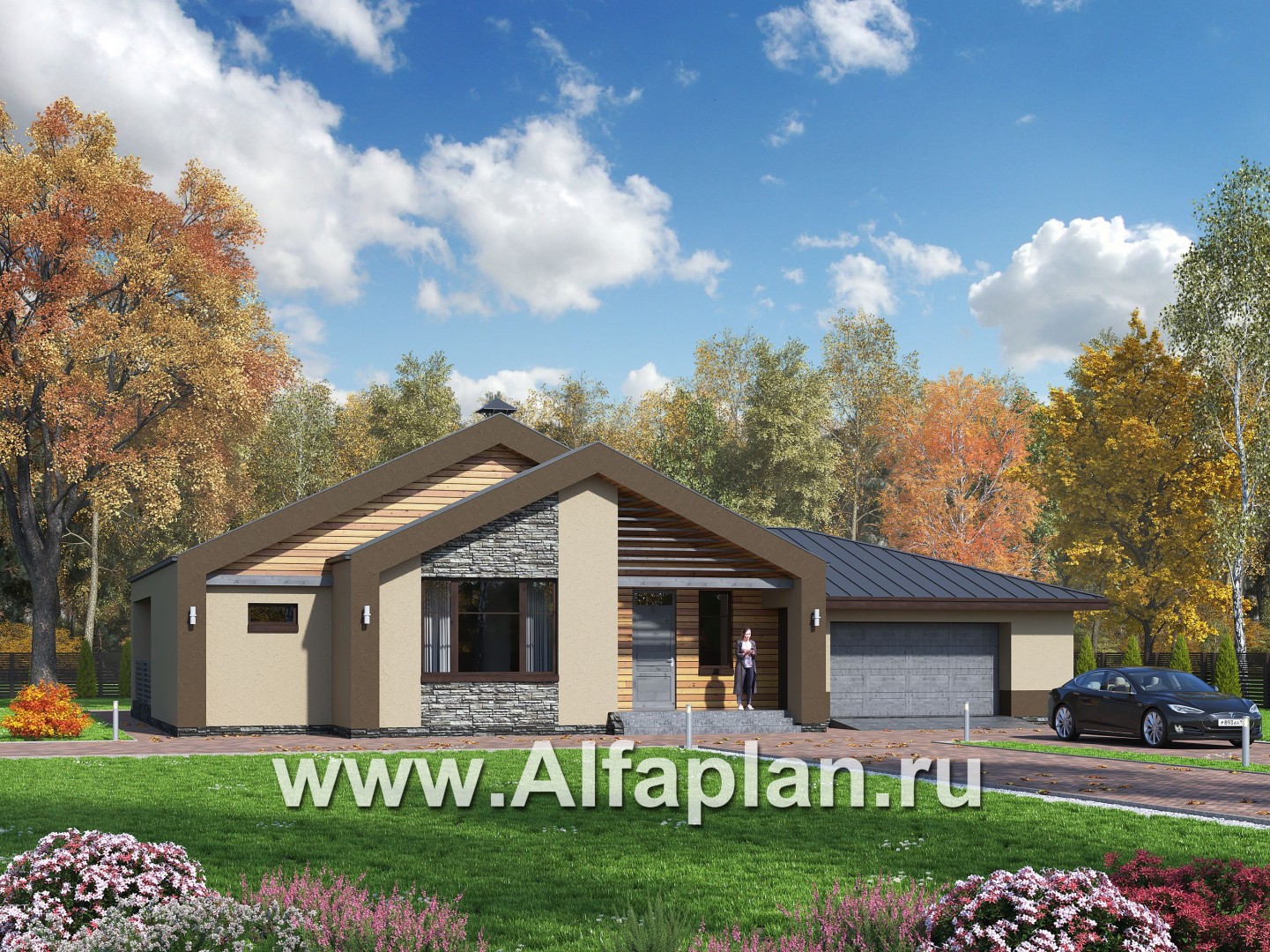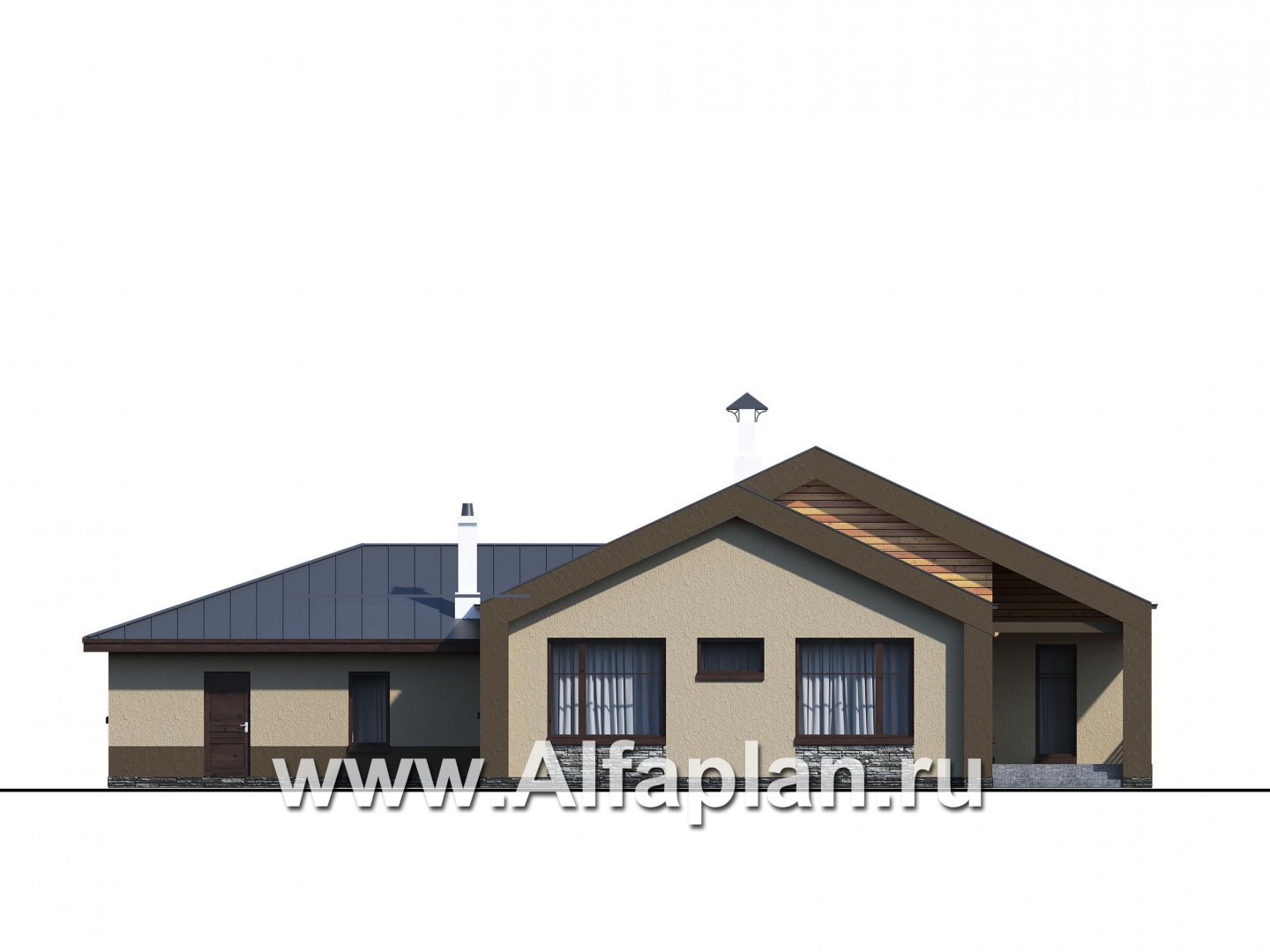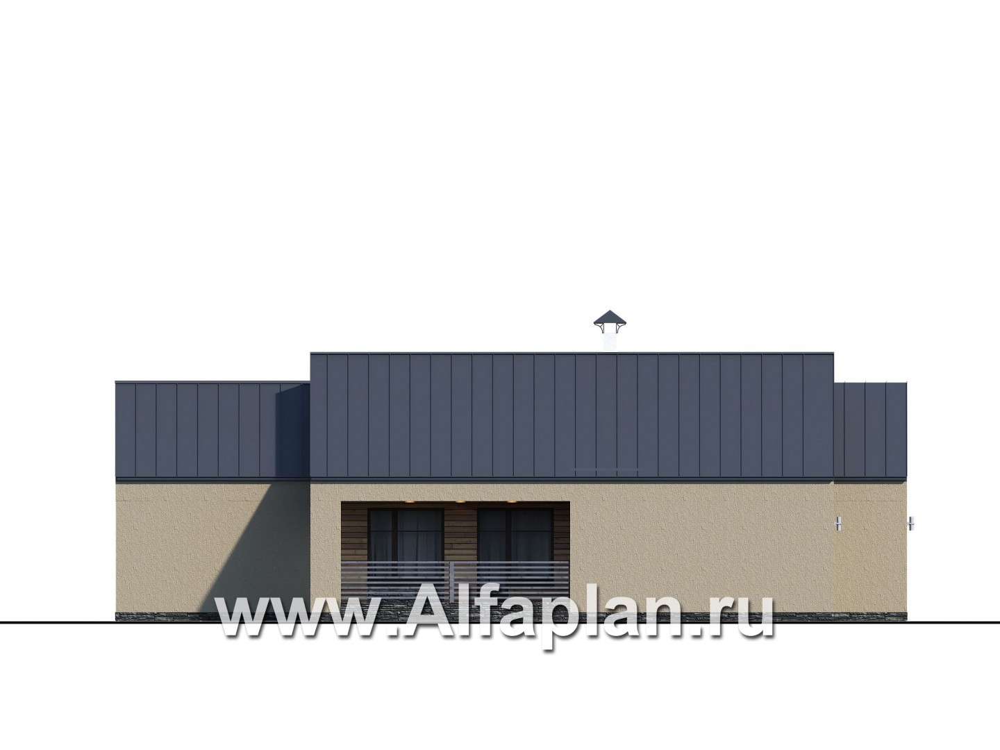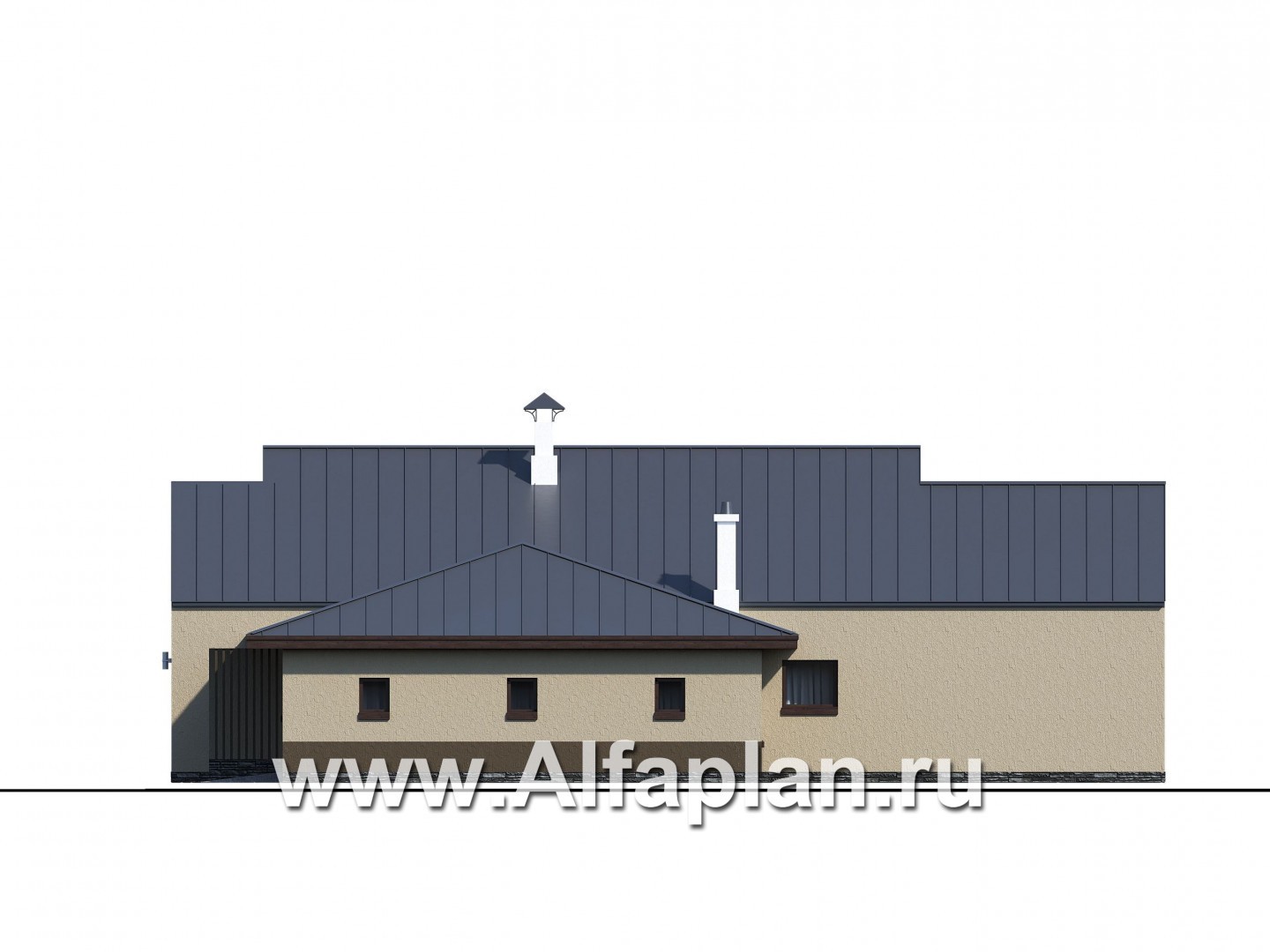 «Аркада» - проект одноэтажного дома, современный стиль, барнхаус, с террасой, сауной и с гаражом