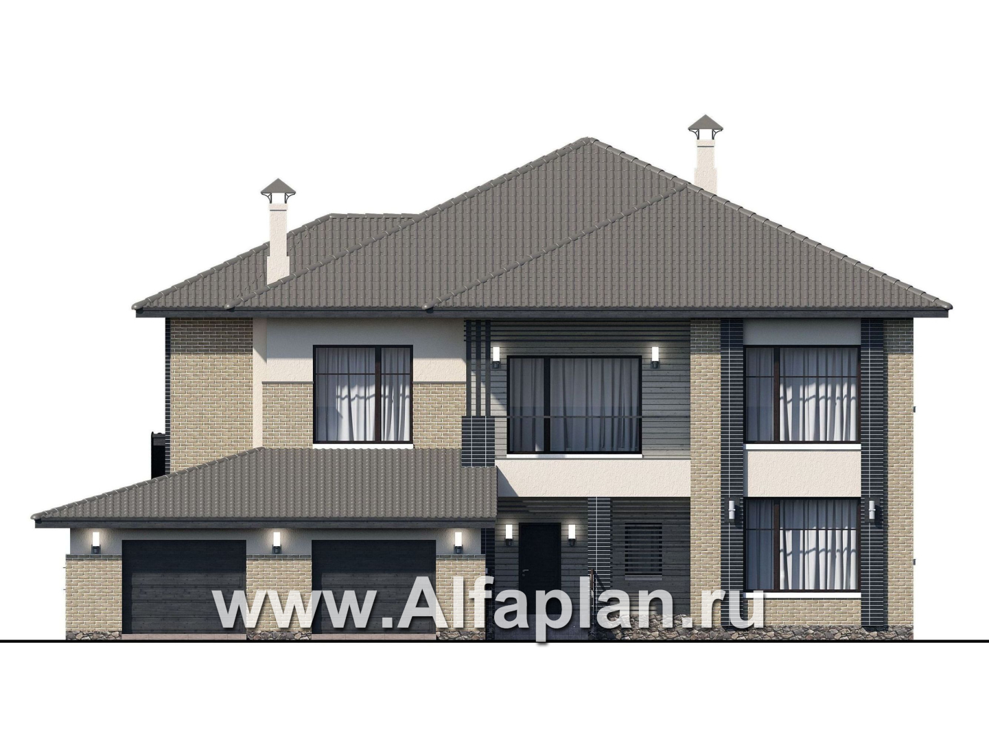 Фасад современной виллы облицован кирпичами, со вставками из штукатурки и керамической плитки. Над крыльцом в дом организован балкон под кровлей. Вертикали на фасаде дома контрастируют с горизонталями пристроенного гаража.
