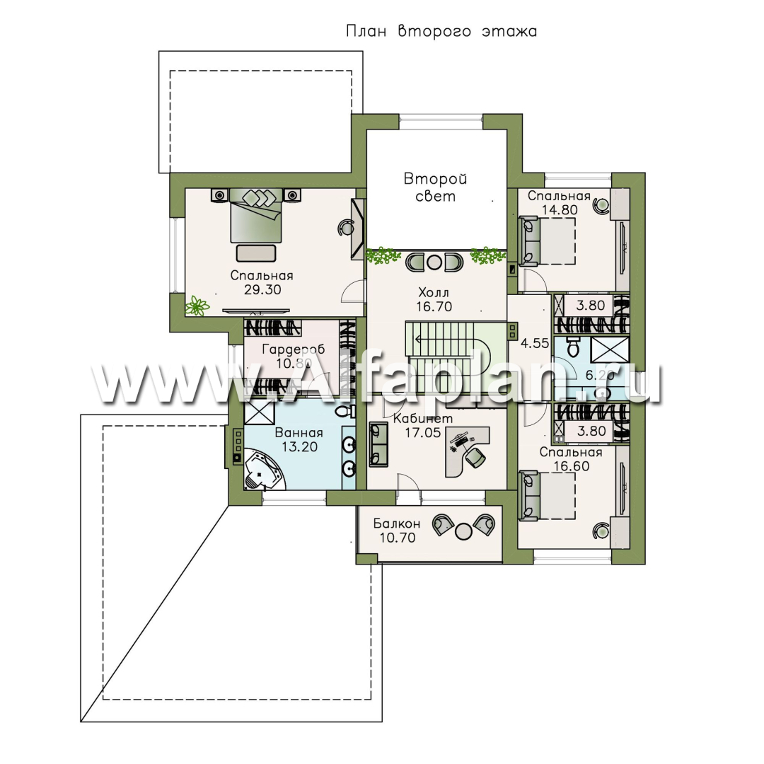 На плане второго этажа – мастер-спальня, две детских, и кабинет. Из холла открывается красивый вид во второй свет гостиной.