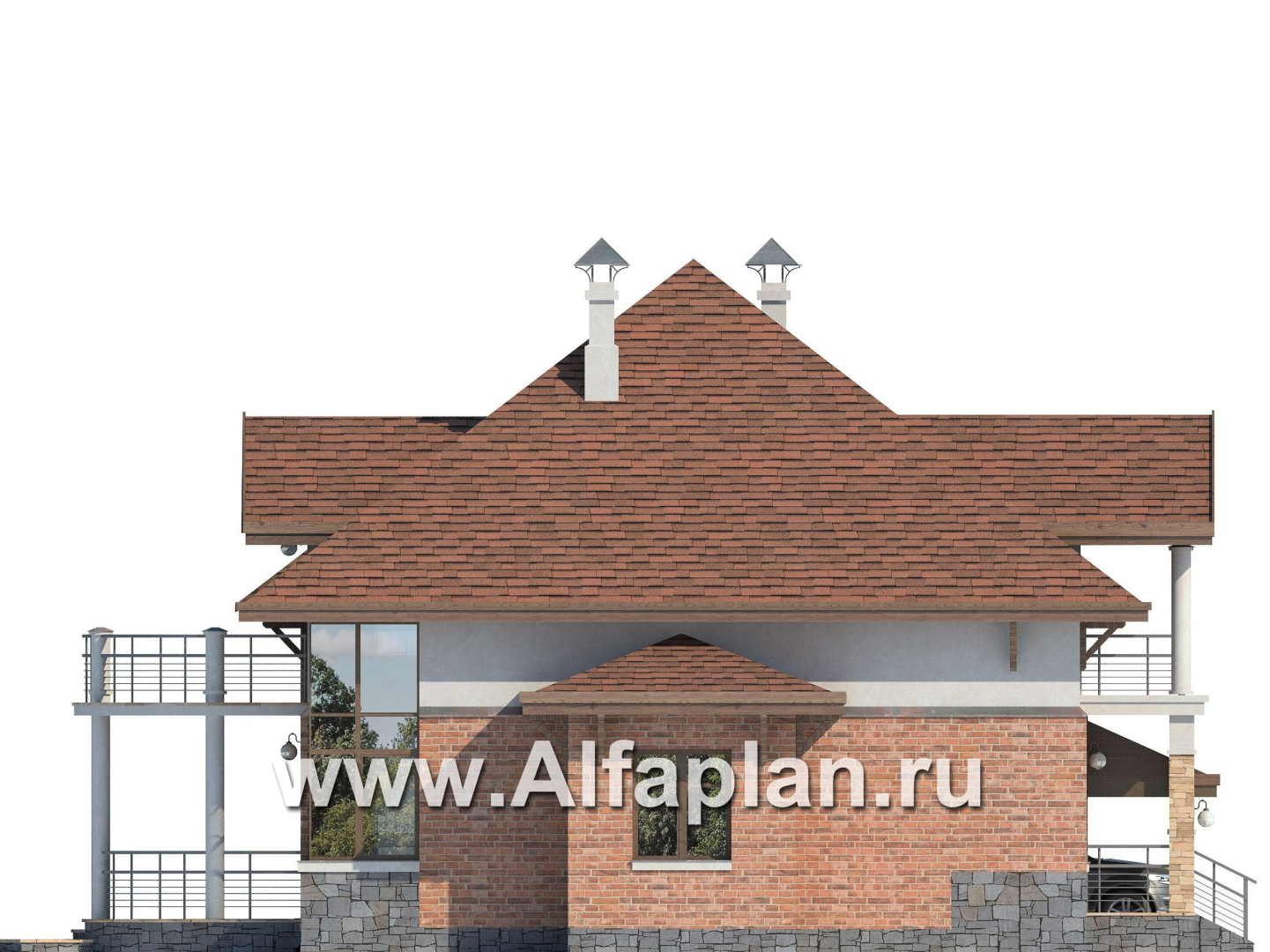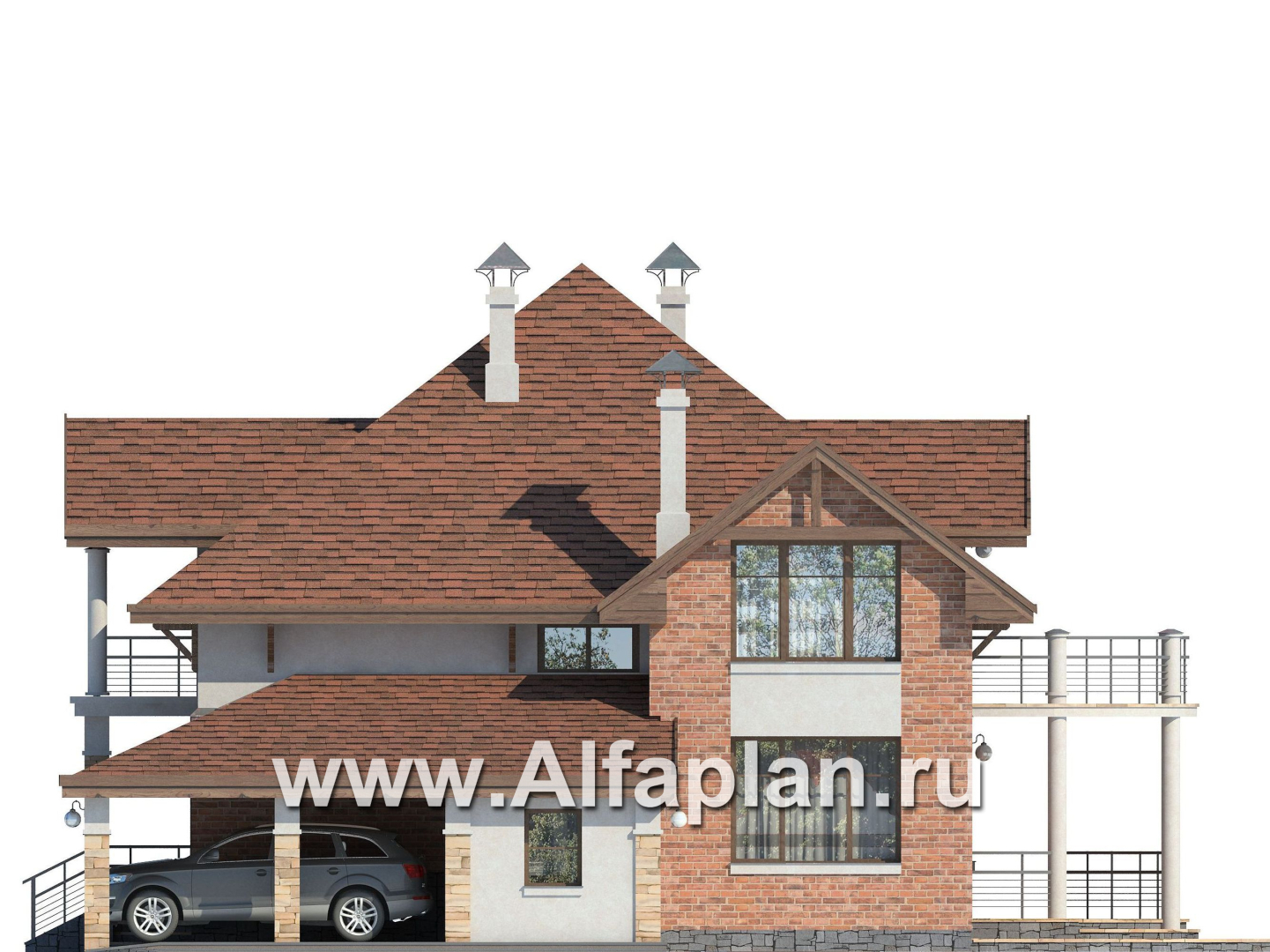 142A-S «Брилланте» - проект дома с мансардой, из кирпичей, с террасой и гаражом-навесом, с пирамидальной кровлей