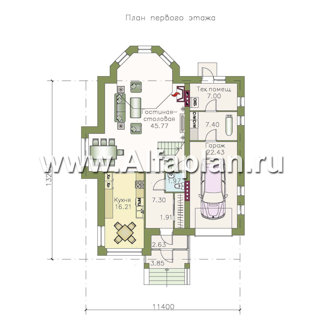 Центральным помещением первого этажа является большая гостиная-столовая. Оригинальность ей придают два эркера – в том числе большой эффектный многогранник, – а также лестница на второй этаж. Кроме того, здесь же, в уголке отдыха, располагается камин
