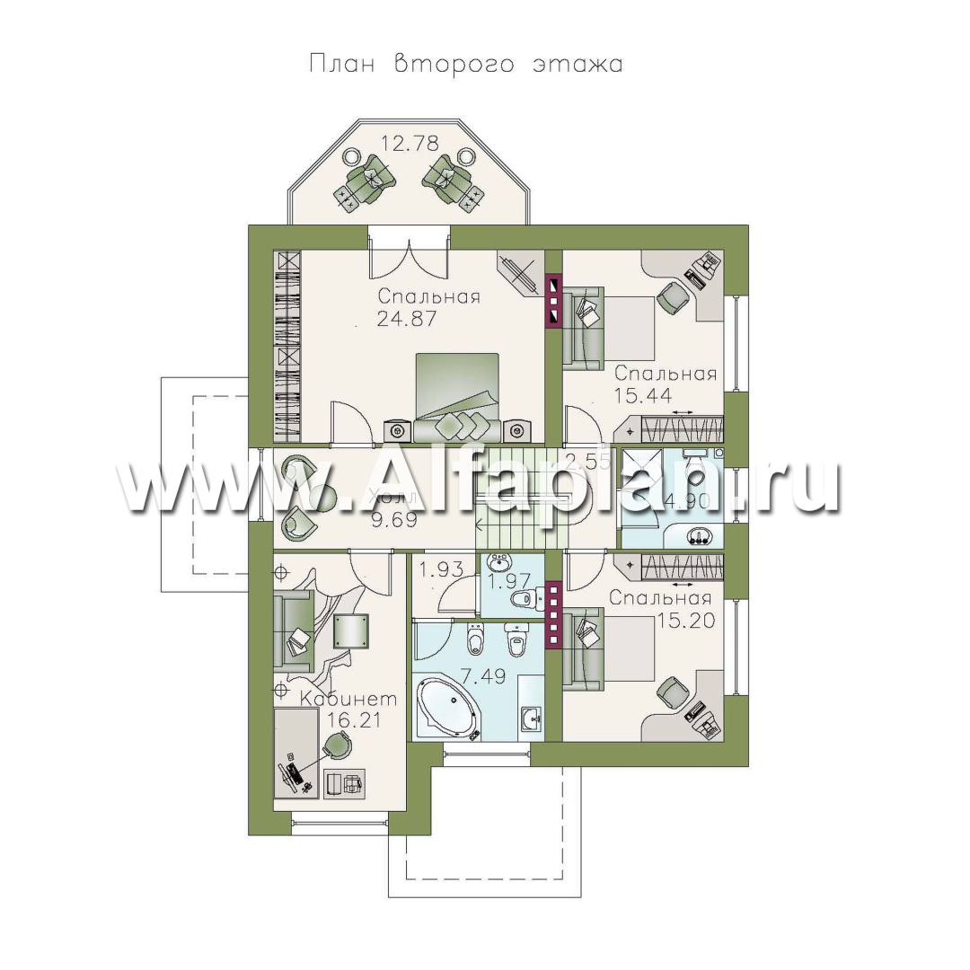 Согласно проекту, центральную часть второго этажа занимает холл с небольшой зоной отдыха, вокруг которого группируются помещения приватной зоны. Это три спальни, причем одна, более просторная, имеет выход на балкон. Две другие, равнозначные по площади и планировке, расположены в мансардной части. Кроме прочего, на втором этаже нашлось место для изолированного кабинета.