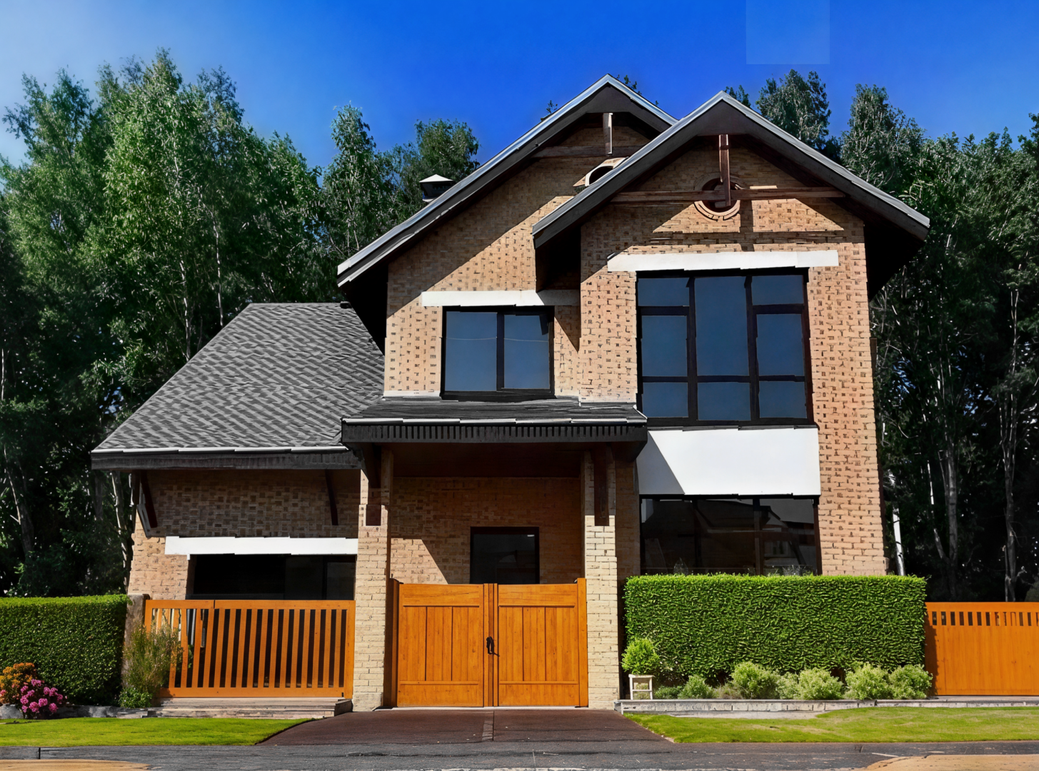Ощущение воздушности, создаваемое коваными элементами и большим количеством остекленных поверхностей, усиливается благодаря светлому оттенку отделочного кирпича. Еще один элемент, добавляющий гармоничности картине, – декоративные внешние сваи.