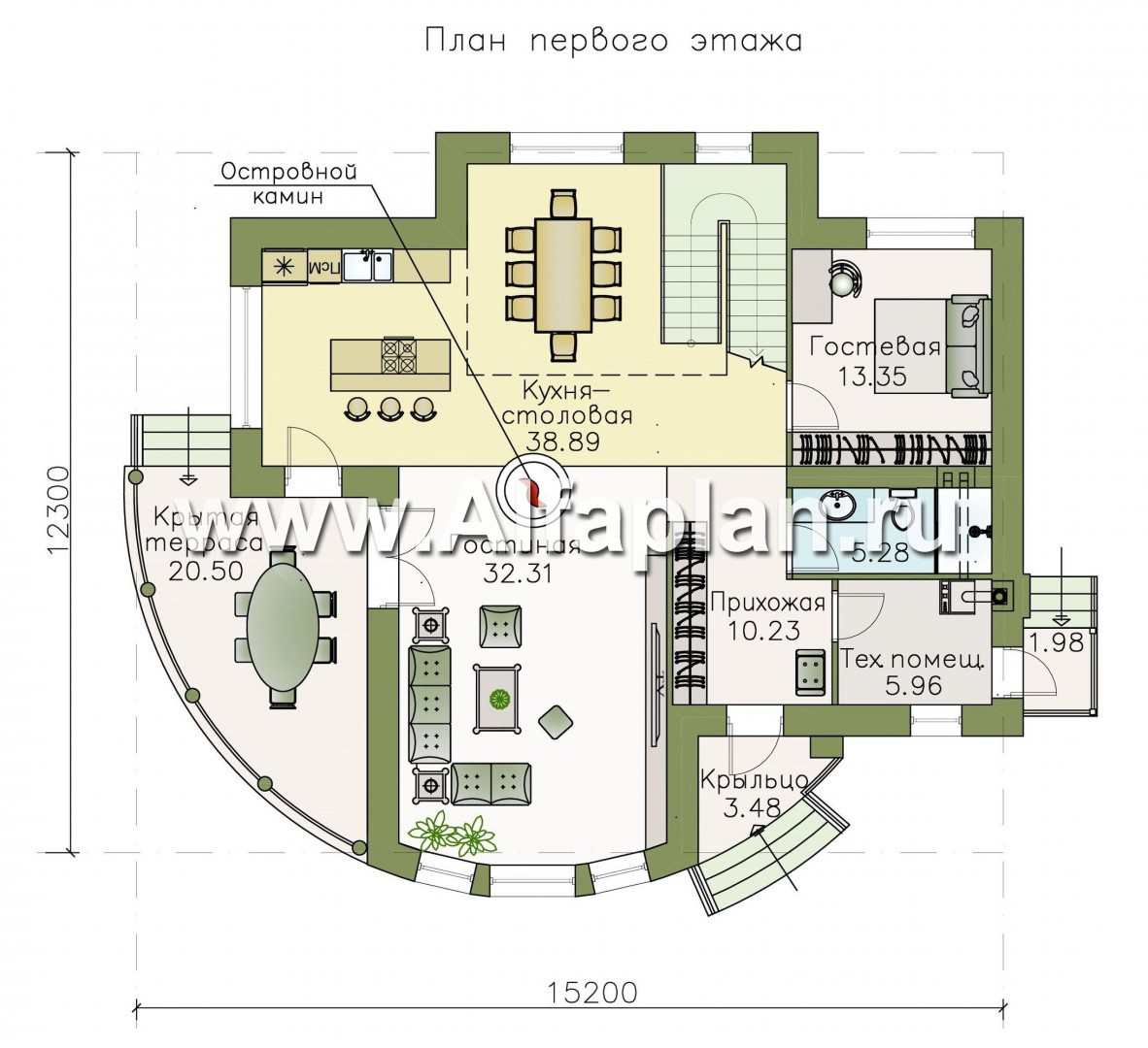 577A-S «Меркурий» - проект двухэтажного дома, с террасой и балконом, столовая со вторым светом, островной камин