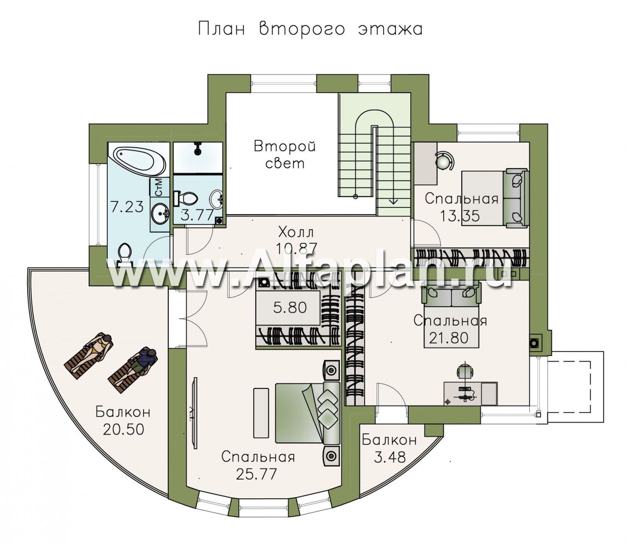 На втором этаже три большие спальные комнаты, одна из которых выходит на вышеописываемый балкон. Также здесь подразумевается два санузла – первый небольшой для душевой кабины и унитаза, второй – более просторный, в нем можно установить угловую ванную с джакузи.