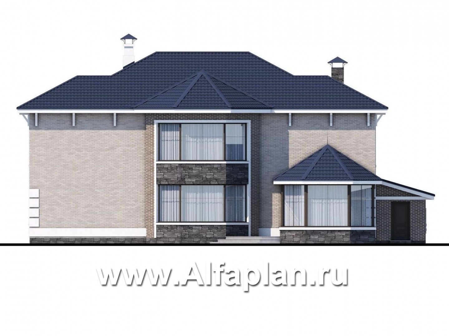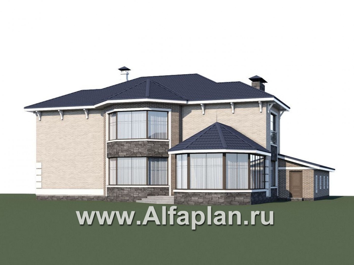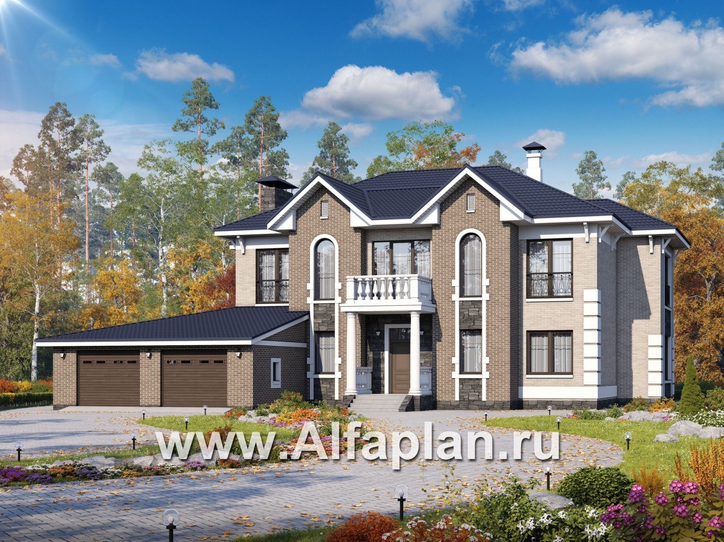 Представленный проект дома можно отнести к строению бизнес класса. Общая площадь здания более 300 кв. м. Проектом предусмотрено два полноценных жилых этажа, закрытая веранда и большой гараж, рассчитанный на два автомобиля. Площадь гаража позволяет использовать его не только по прямому назначению, но и при желании оборудовать мастерскую. Фасадное крыльцо украшают колонны, а само здание немного напоминает викторианскую виллу.