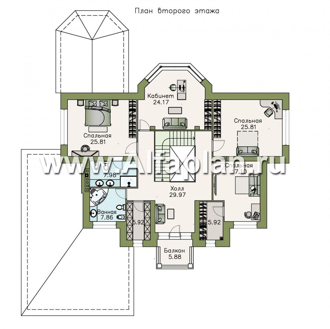 Второй этаж также начинается с холла. Здесь расположены три спальни и отдельный рабочий кабинет с эркером и панорамными окнами. Есть выход и на небольшой балкончик, которой служит скорее украшением здания – его можно декорировать цветами или плющом. Одна из спальных комнат оборудована собственным санузлом, который подразумевает монтаж душевой кабины. Общий санузел подходит для установки большой угловой ванны. К самой маленькой спальне примыкает еще одно помещение, которое можно использовать как гардеробную.