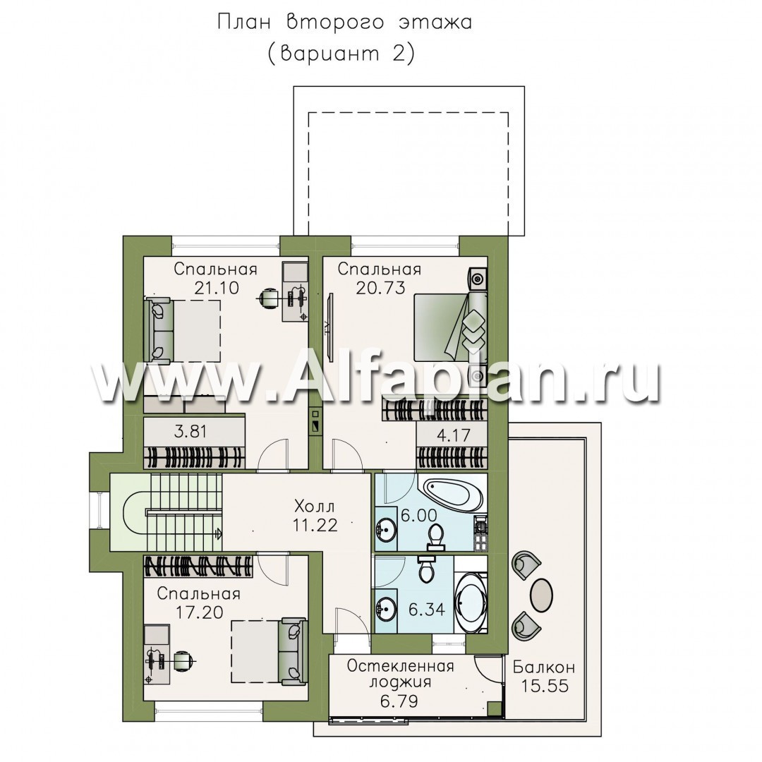 Второй этаж – это истинно жилое помещение, территория хозяев – три большие спальни, ванная, совмещенная с туалетом, душевая кабинка, остекленная лоджия… Если предполагается проживание двух-трех поколений семьи, то в проект дома могут быть внесены изменения и тогда на втором этаже появится два раздельных санузла. При этом не пострадает площадь спален – согласитесь, это важно. В любом варианте предусмотрены и гардеробные, и балкон – вот и дополнительная зона уединенного отдыха.