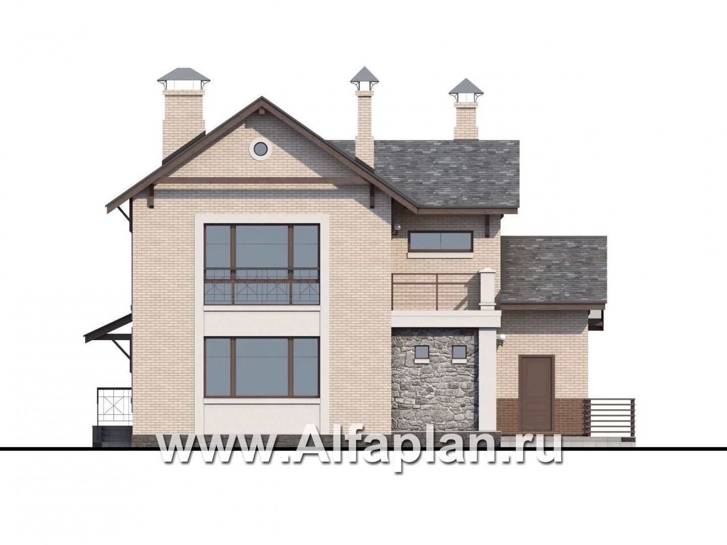 Отправной точкой при разработке этого проекта кирпичного (газобетонного) дома, несомненно, послужил скандинавский стиль – отсюда и строгая геометричность форм, и сдержанность цветовой гаммы. Фасад,  выполненный в бежево-коричневых тонах с вкраплением белых декоративных элементов, отлично гармонирует со свинцово-серой кровлей из натуральной (или битумной) черепицы.