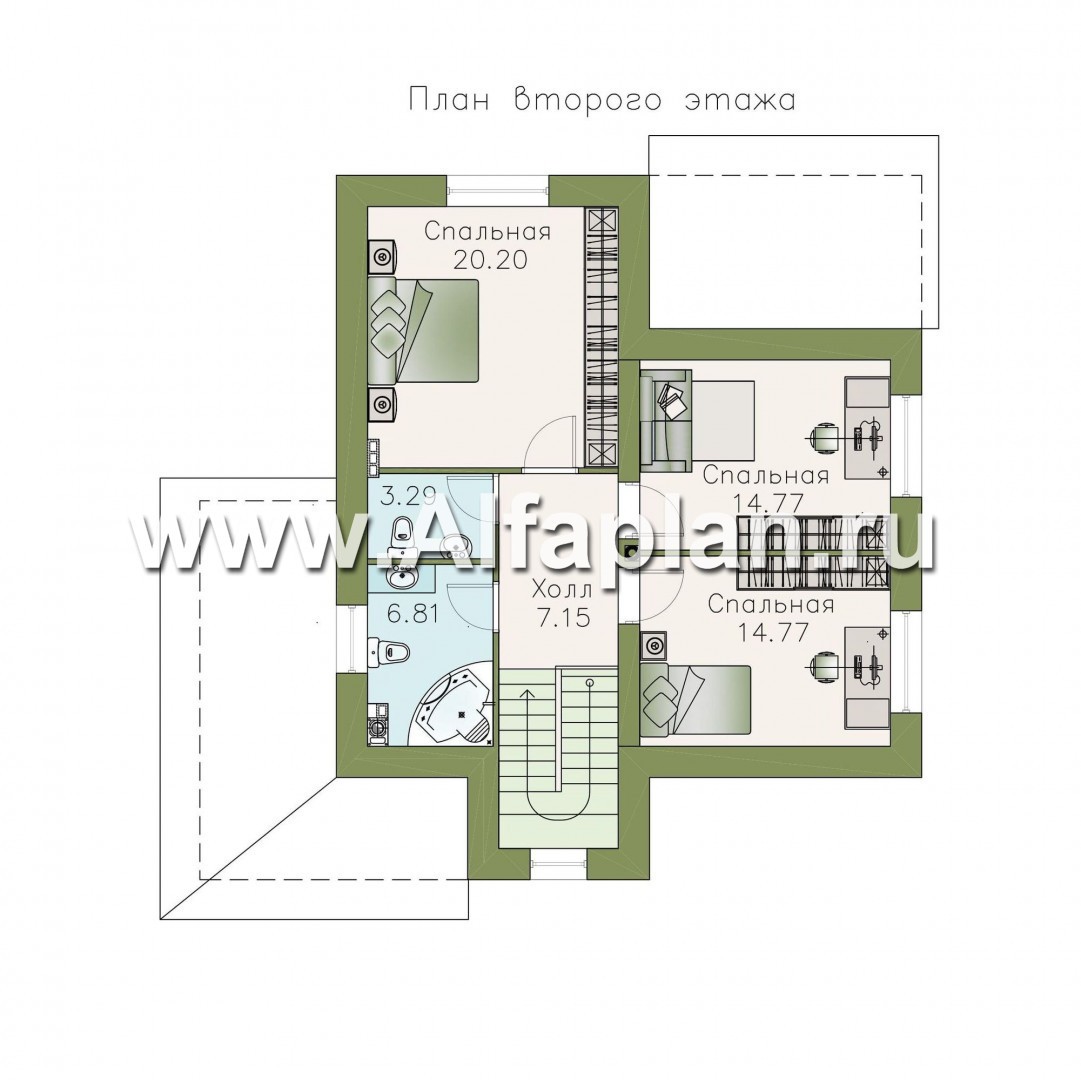 Второй этаж, согласно проекту дома из кирпича (пено-, газобетона), целиком отдан под приватную группу. Она представлена тремя спальнями, две из которых являются смежными. На этаже предусмотрено два общих санузла , которые, вместе с остальными помещениями, сгруппированы вокруг небольшого холла.