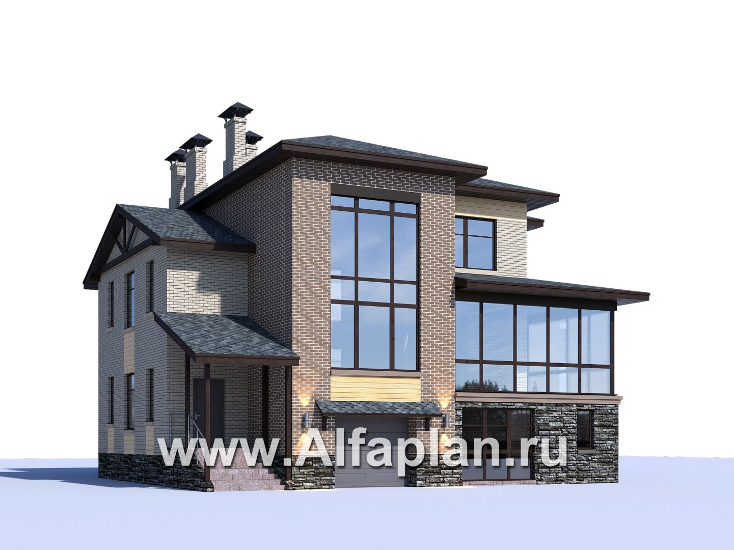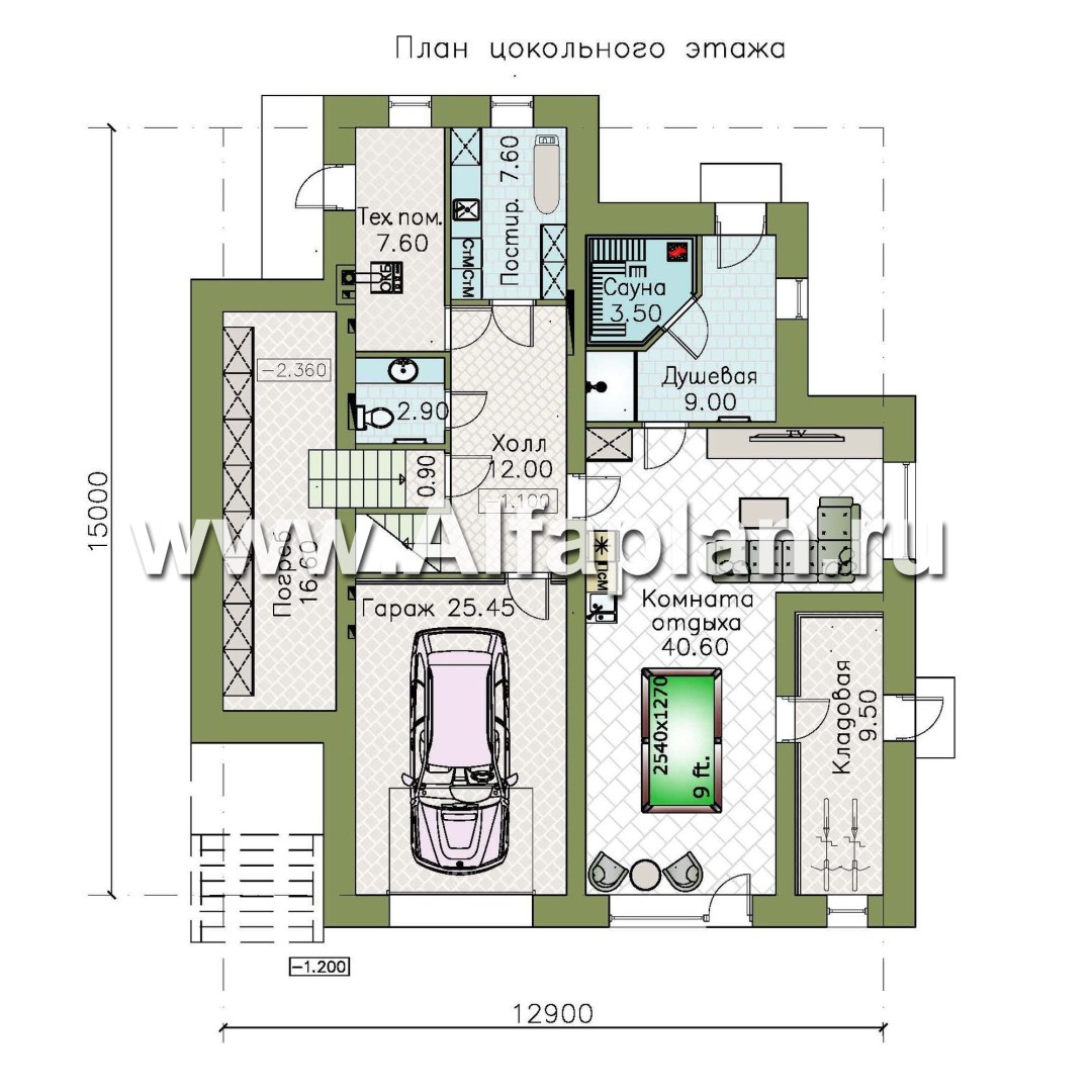 «Амур» - проект трехэтажного дома, с гаражом в цоколе и с сауной, с двусветной гостиной