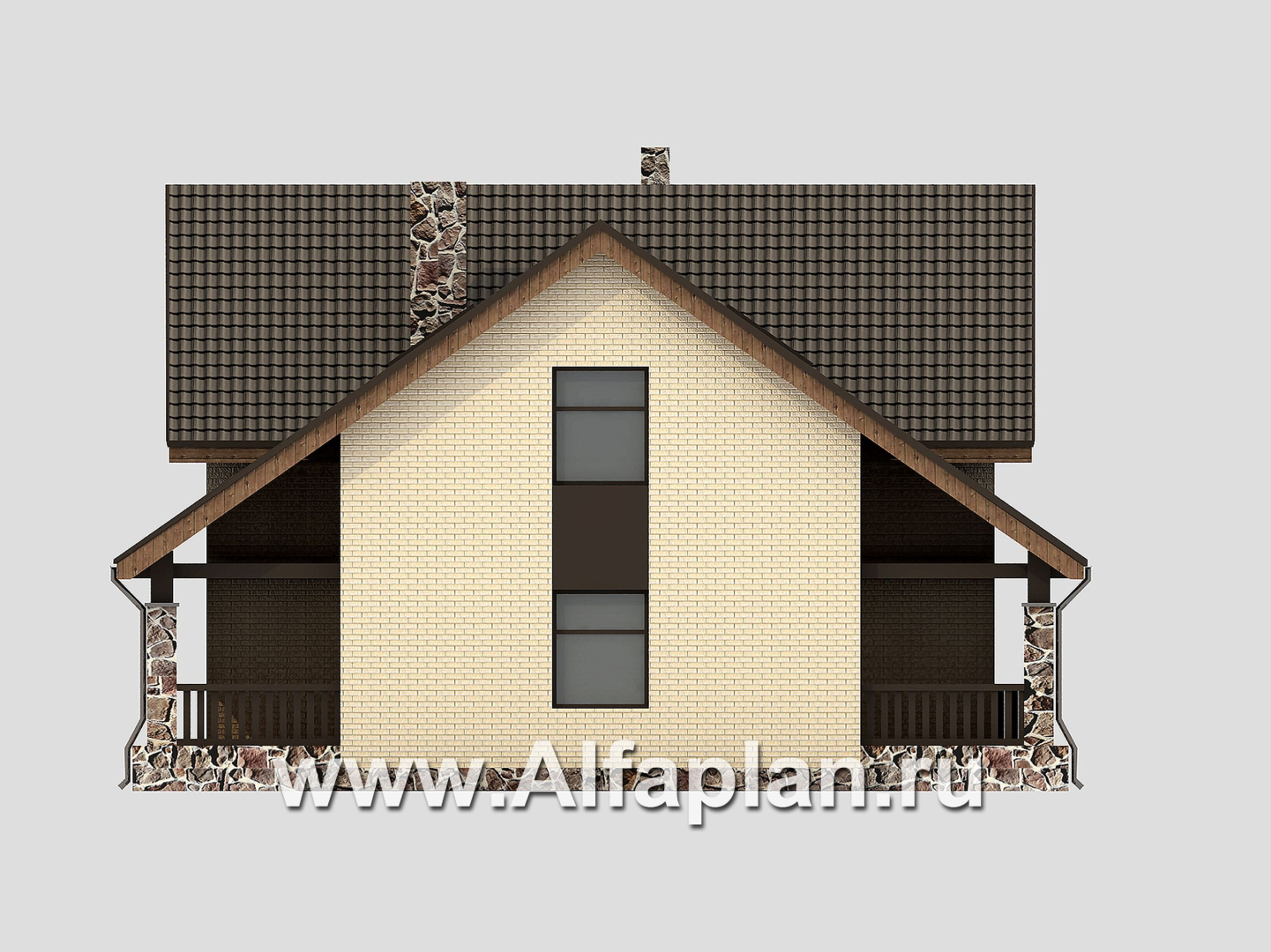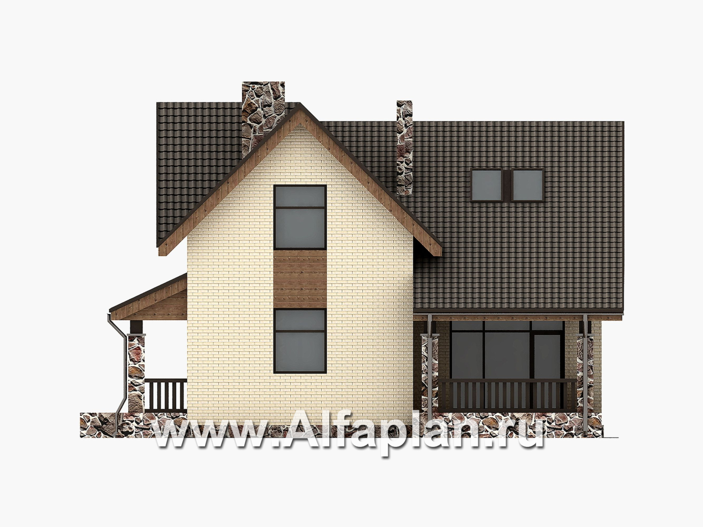 Проектом дома из керамических блоков или газобетона предусмотрен и второй вариант цветового оформления фасада. Это может быть лицевой кирпич теплого охристого оттенка и контрастирующий с ним жемчужно-серый рустовый камень. В таком случае выделить очертания кровли предлагается за счет декоративных элементов белого цвета.
