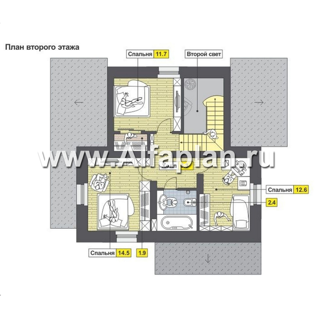 Второй, мансардный, этаж, согласно проекту блочного (газобетонного) дома, отдан под приватную группу. Это три спальни, причем у той, что расположена со стороны дворового фасада, предусмотрена собственная гардеробная. Все три помещения вместе с санузлом общего пользования сгруппированы вокруг холла со вторым светом.