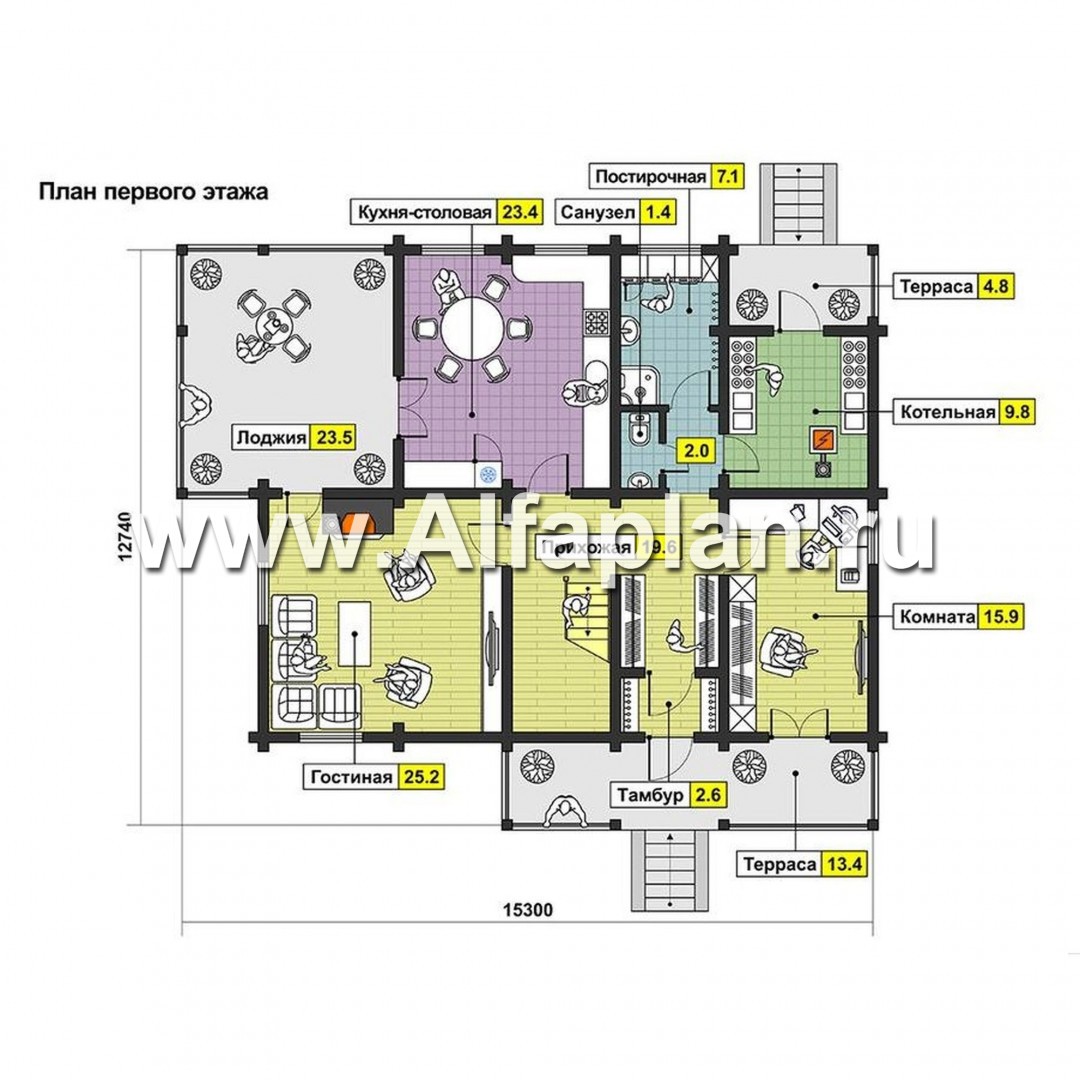 Современный дом из клееного бруса с комфортной планировкой и традиционным для деревянного зодчества обликом может служить и сезонным и постоянным жильем. Натуральный материал стен делают его экологичным и еще более привлекательным. В доме два этажа, второй - мансардный. Комфортность обеспечивается не только внутренней планировкой, но и примыкающими к дому террасами. На первом этаже запроектированы гостиная, кухня- столовая, котельная, небольшая постирочная и жилая комната. Наличие жилой комнаты на первом этаже особенно оценят старшие члены семьи. На втором этаже расположены три спальни, ванная комната и две просторные гардеробные. Тема террас нашла здесь продолжение в виде открытой лоджии, на которую можно выйти из двух смежных спален.